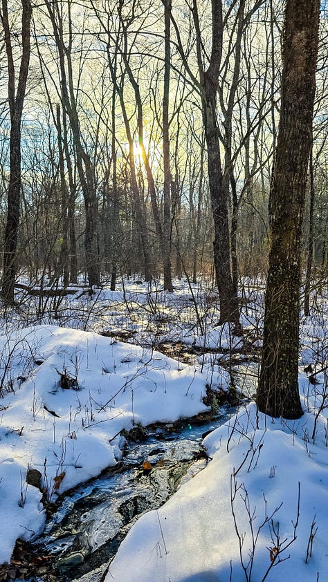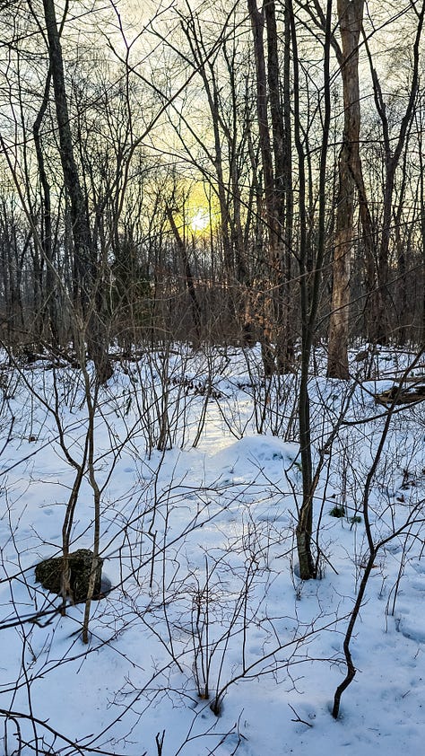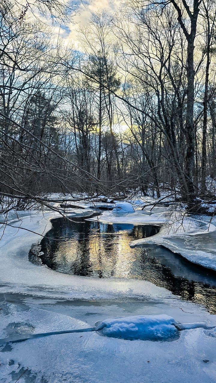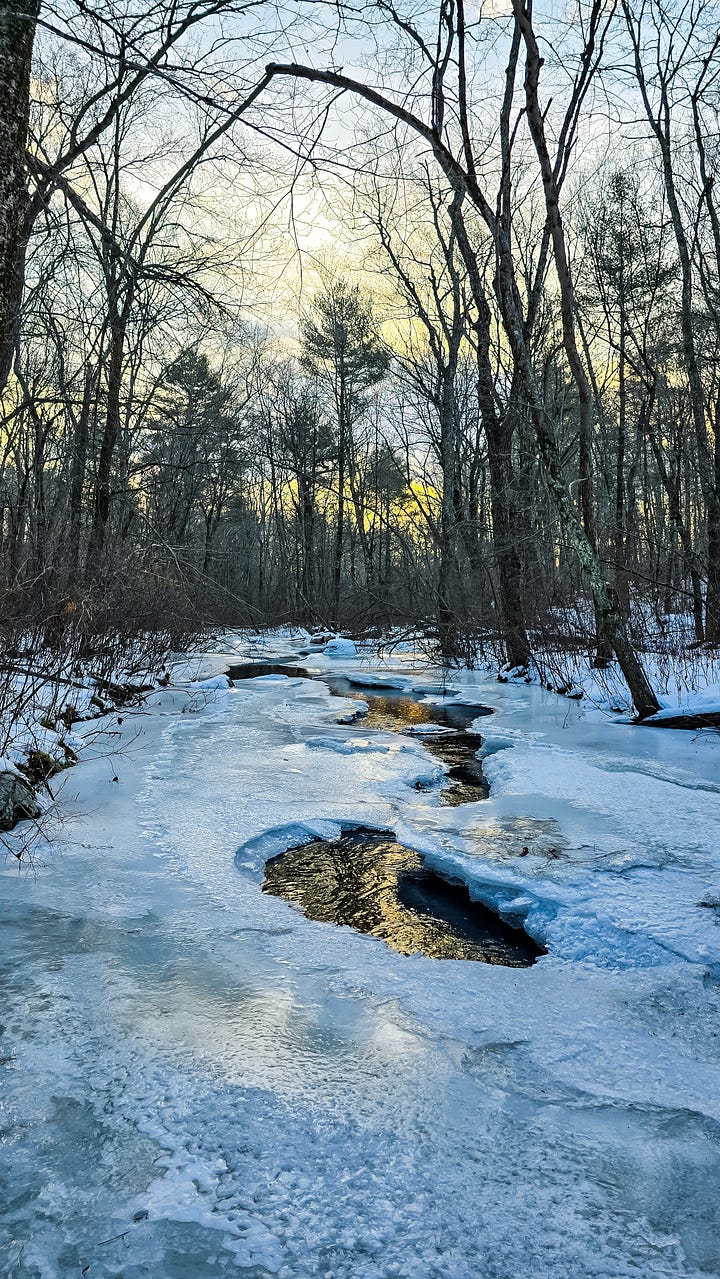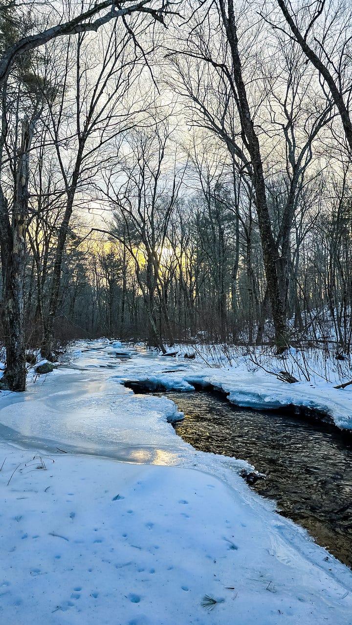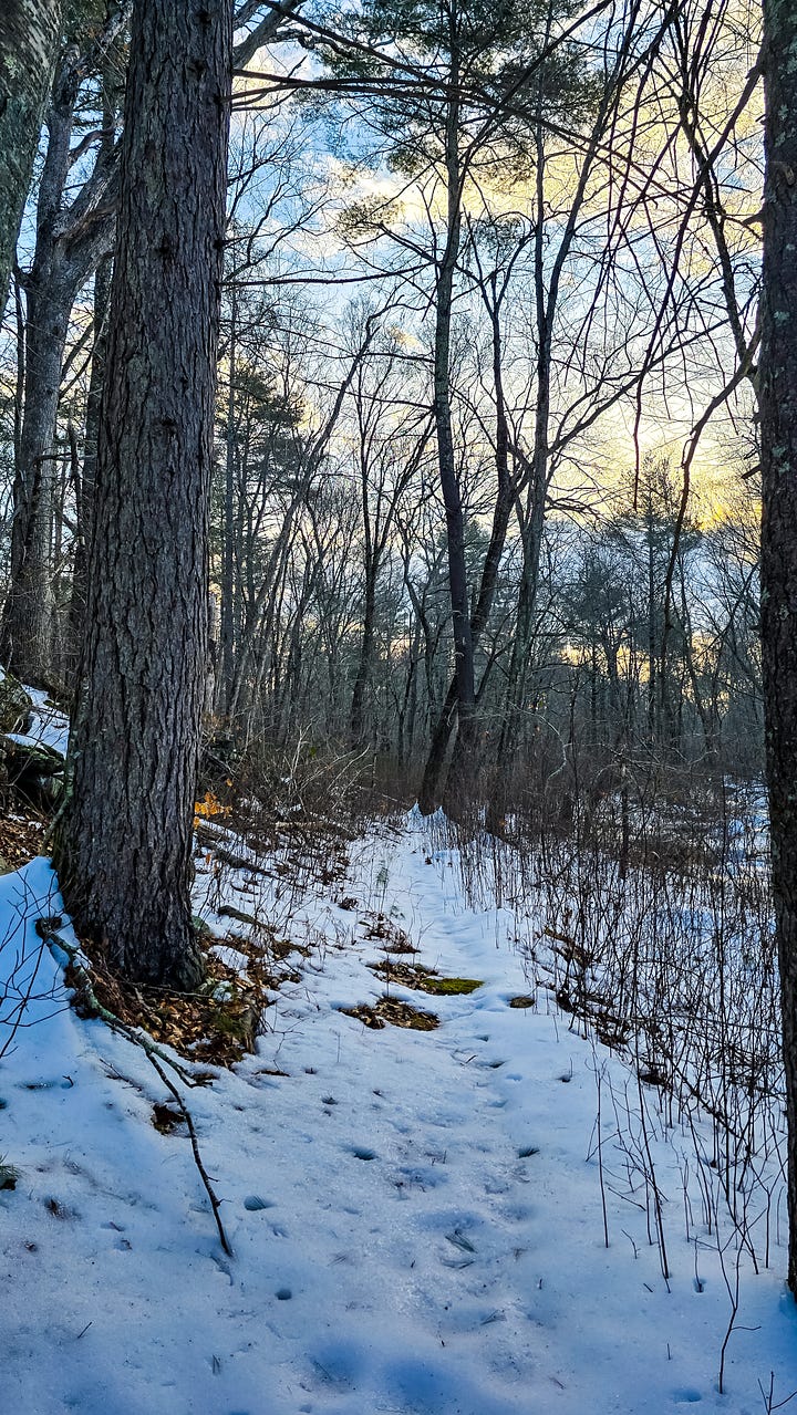 There was still plenty of snow on the ground, crunchy and iced over but not slick as I started off on the yellow trail. I am led through a variety of trees, some empty some still green. It is sooooooo quiet here, and there was so much light through the trees, with almost gradient glow. I intersected with both the Blue Trail and the Red Trail, but pressed on over the Yellow Trail and I am so glad I did. The sun was rising slowly and the sky glowed yellow and gold through remarkable trees. The Ponaganset river was getting closer in view as I sloped downhill.