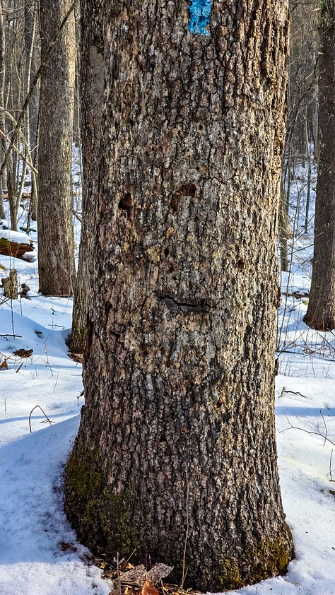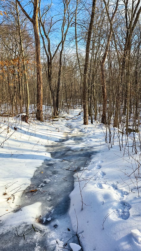 A tree sign indicates a “Mill Site” but offers no other information, so naturally I went that way. I passed old stone foundations, and multiple stone wall intersects, harkening to years gone by when Thomas Hopkins and his sons lived and worked the Ponaganset River for a gristmill in the 1700’s. As I made my way around a few of the walls I saw there was a trail down to the river, and then came the sun gleaming on the icy water. The river lies between two slopes and had a natural build up of ice on the banks. It was so so so so amazing to stand practically in the middle of a river on an ice shelf. That definitely made the highlight of the trail system. Had I followed the unnamed trails down the river I’d have made it to a different trail system all together - maybe next time. I found the Red Trail - aptly named Rocky Trail - because it definitely was rocky as it slowly sloped back up the hill. The trees and rocks continued to impress me - it truly showed the variety of the landscape in the area. There are a few tributary streams to cross and one section was a complete ice luge (on an incline of course). I made it to the Blue Trail, and then back to my car.